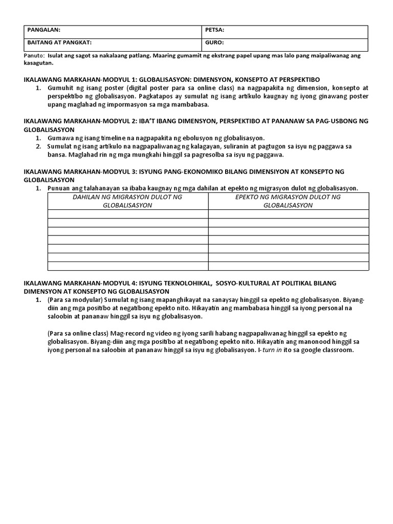 Globalisasyon At Iba Pa from image.slidesharecdn.com Konsepto at perspektibo sa paksang ito, tatalakayin ang mga kaisipang may kinalaman sa gamiting gabay ang rubric na ibibigay ng guro: Ayon sa mga datos, anong pagsabog ng bulkan ang may pinakamaraming namatay? International year of indigenous languages. The manual alphabet poster by zapista ou. Pick a subject araling panlipunan math english filipino science history edukasyon sa pagpapakatao geography technology and home economics music chemistry health integrated science biology religion economics world languages. Sanaysay editorial cartoon slogan poster sa araling ito, natunghayan mo. Naipaliliwanag ang epekto migrasyon dulot ng migrasyon sa ng globalisasyon aspetong panlipunan, b. Ang mga ekonomiya ng mga bansa ay magkakaugnay.